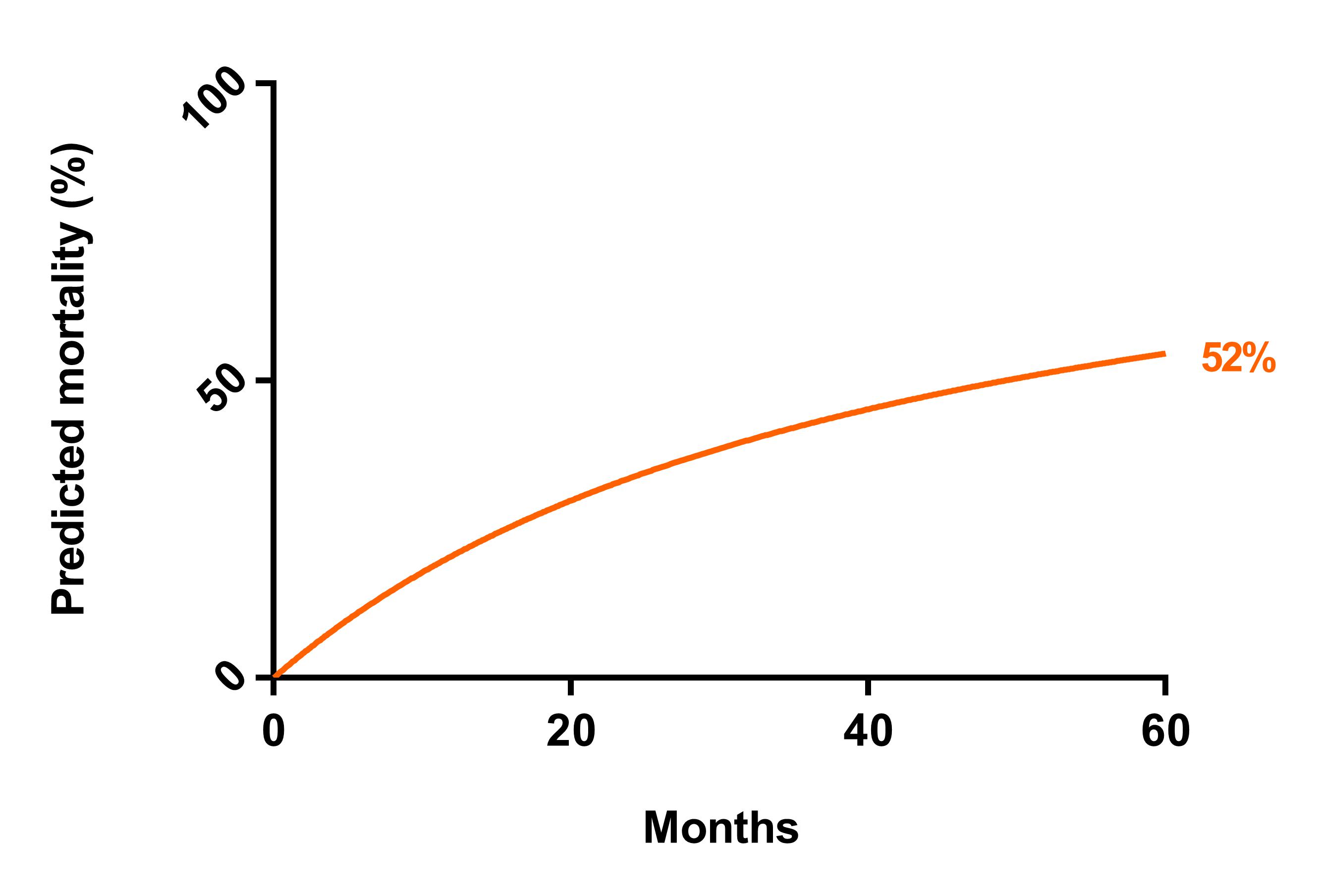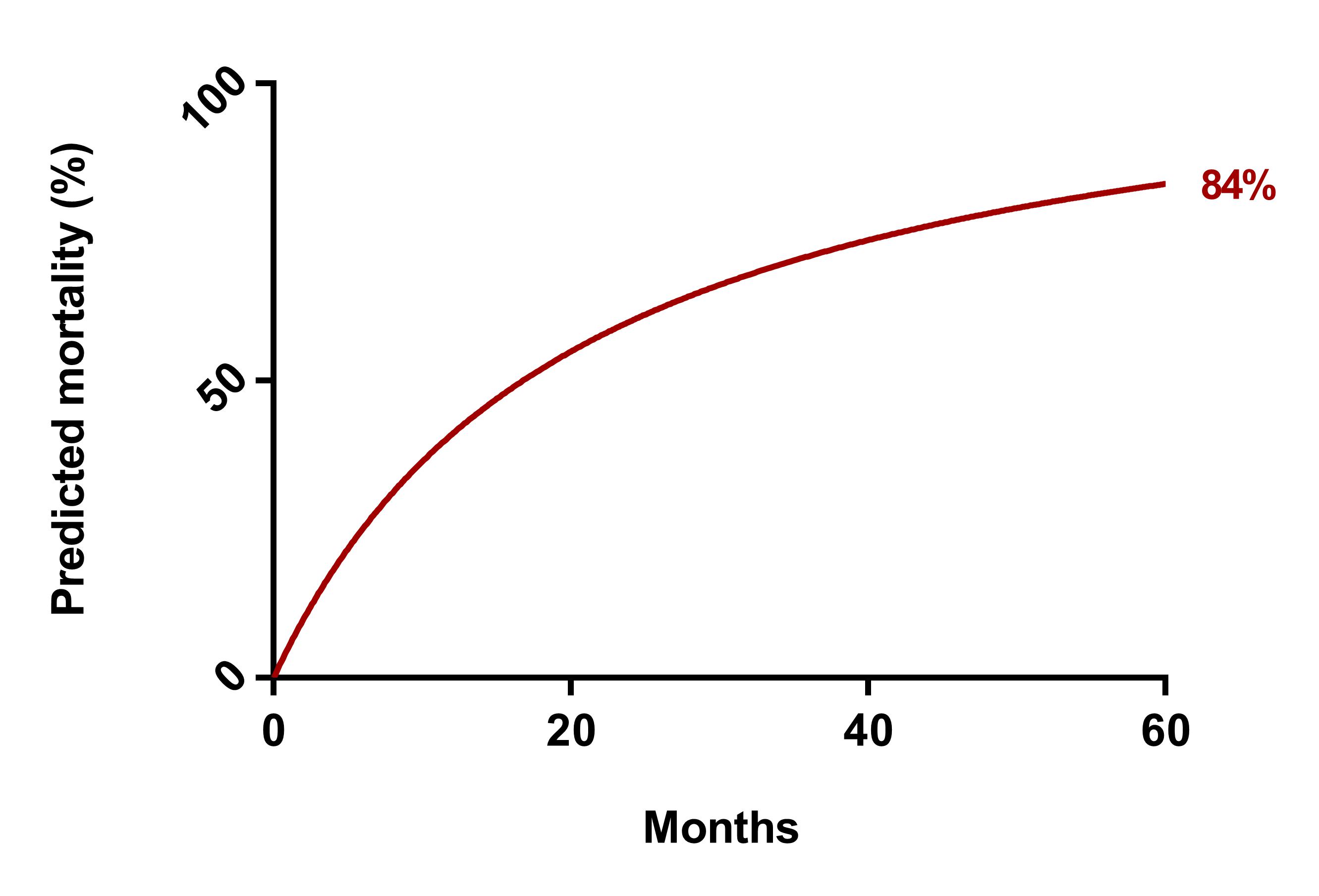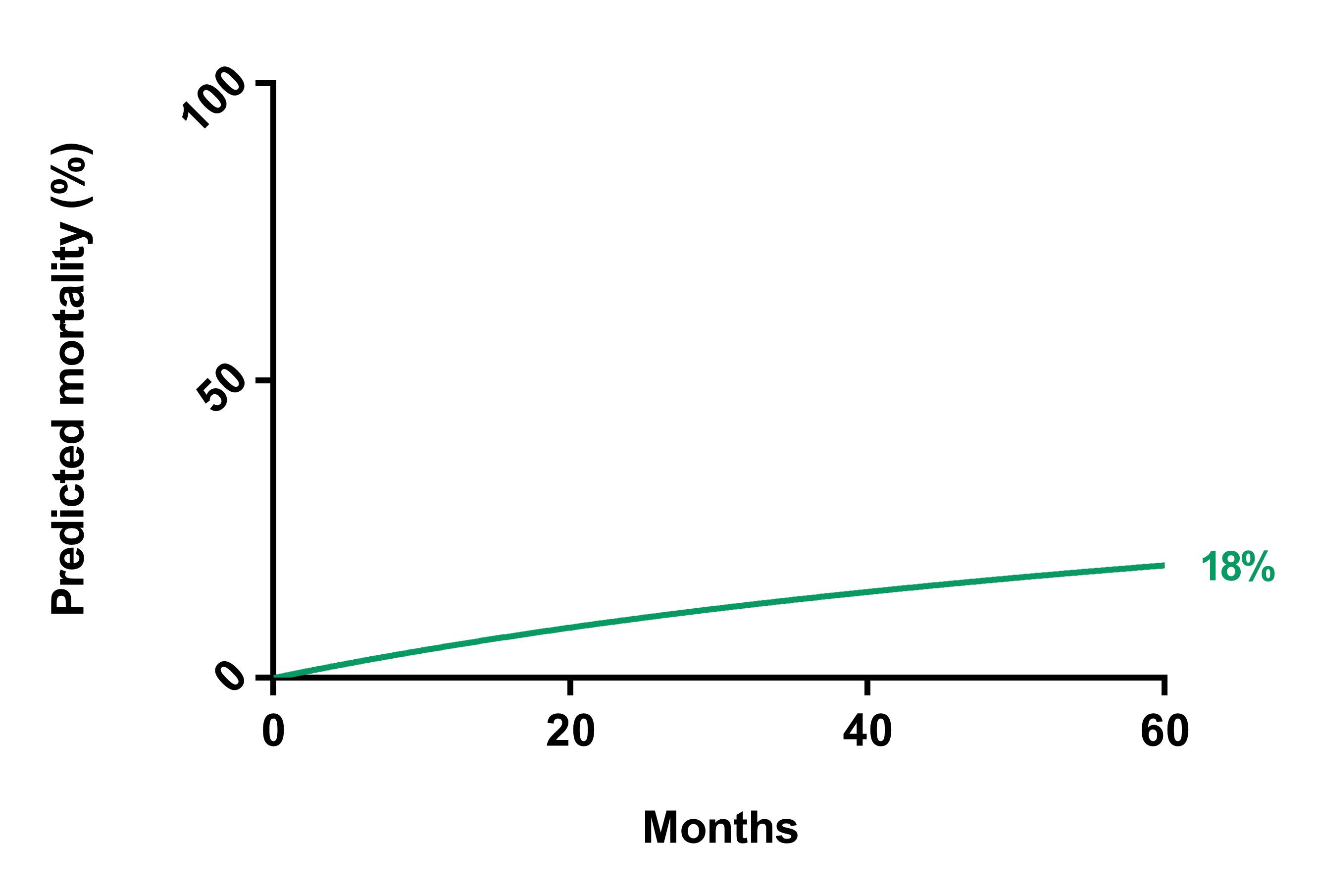 The predicted risk of all-cause mortality at 5 years was 18% in 914 patients (from the TRuE registry) with severe tricuspid regurgitation.